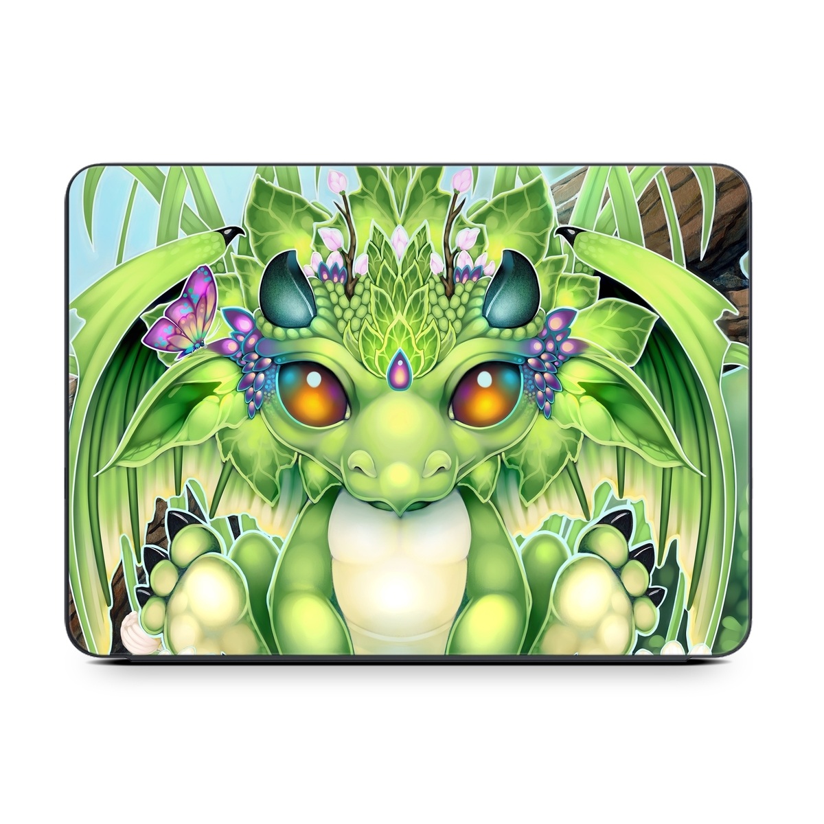iStyles Smart Keyboard Folio for iPad Series Skin design of Plant, Green, Leaf, Natural environment, Flower, Terrestrial plant, Grass, Creative arts, People in nature, Art, with green, white, yellow, brown, blue colors, and tagged with fantasy, animals, flowers, nature, dragon, wings, horns.
