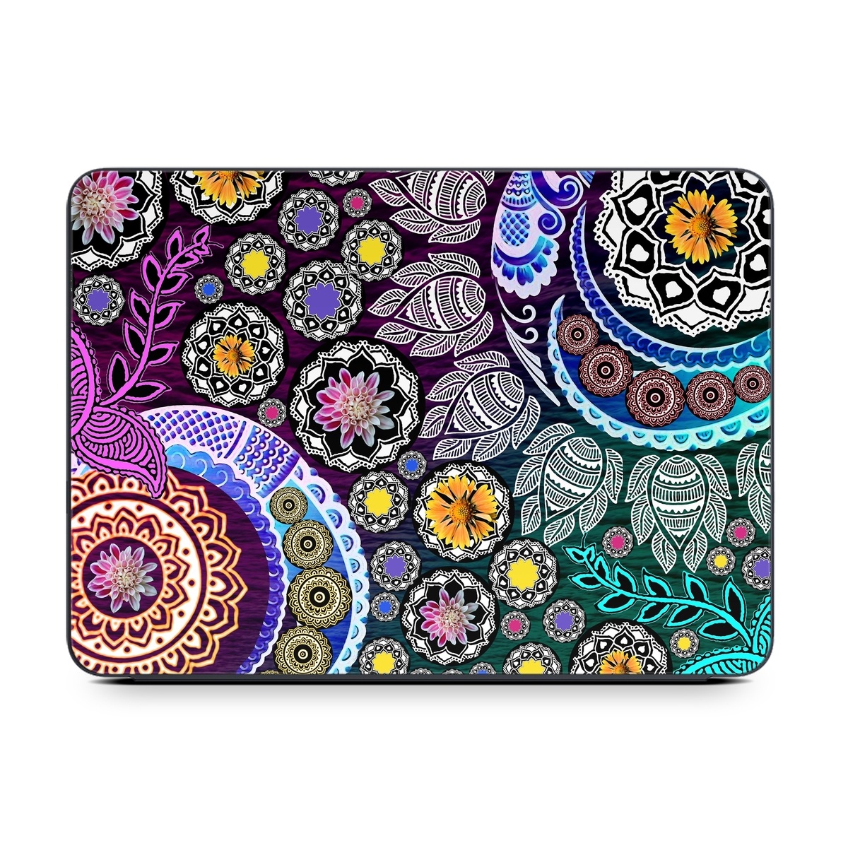 iStyles Smart Keyboard Folio for iPad Series Skin design of Pattern, Psychedelic art, Art, Visual arts, Design, Floral design, Textile, Motif, Circle, Illustration, with black, gray, purple, blue, green, red colors, and tagged with patterns, flowers.
