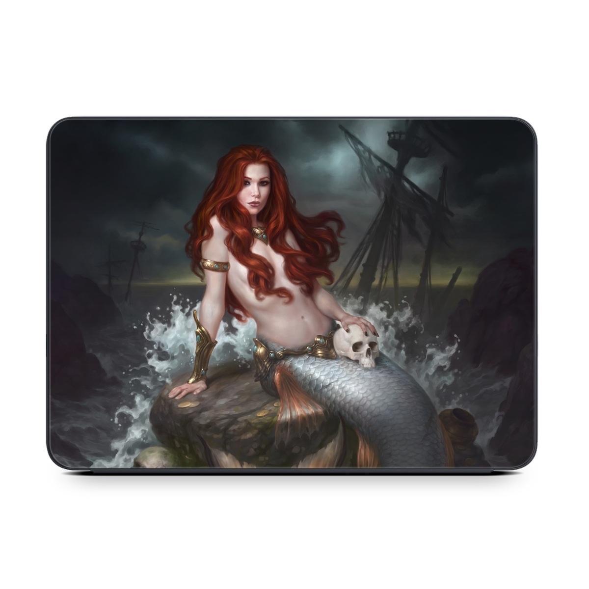 iStyles Smart Keyboard Folio for iPad Series Skin design of Mermaid, Cg artwork, Illustration, Fictional character, Mythology, Mythical creature, Art, Long hair, Woman warrior, Sitting, with black, brown, red, yellow, white, gray colors, and tagged with fantasy, skulls, people, fantasy, mermaid, ocean, pirateships, ships, skull.