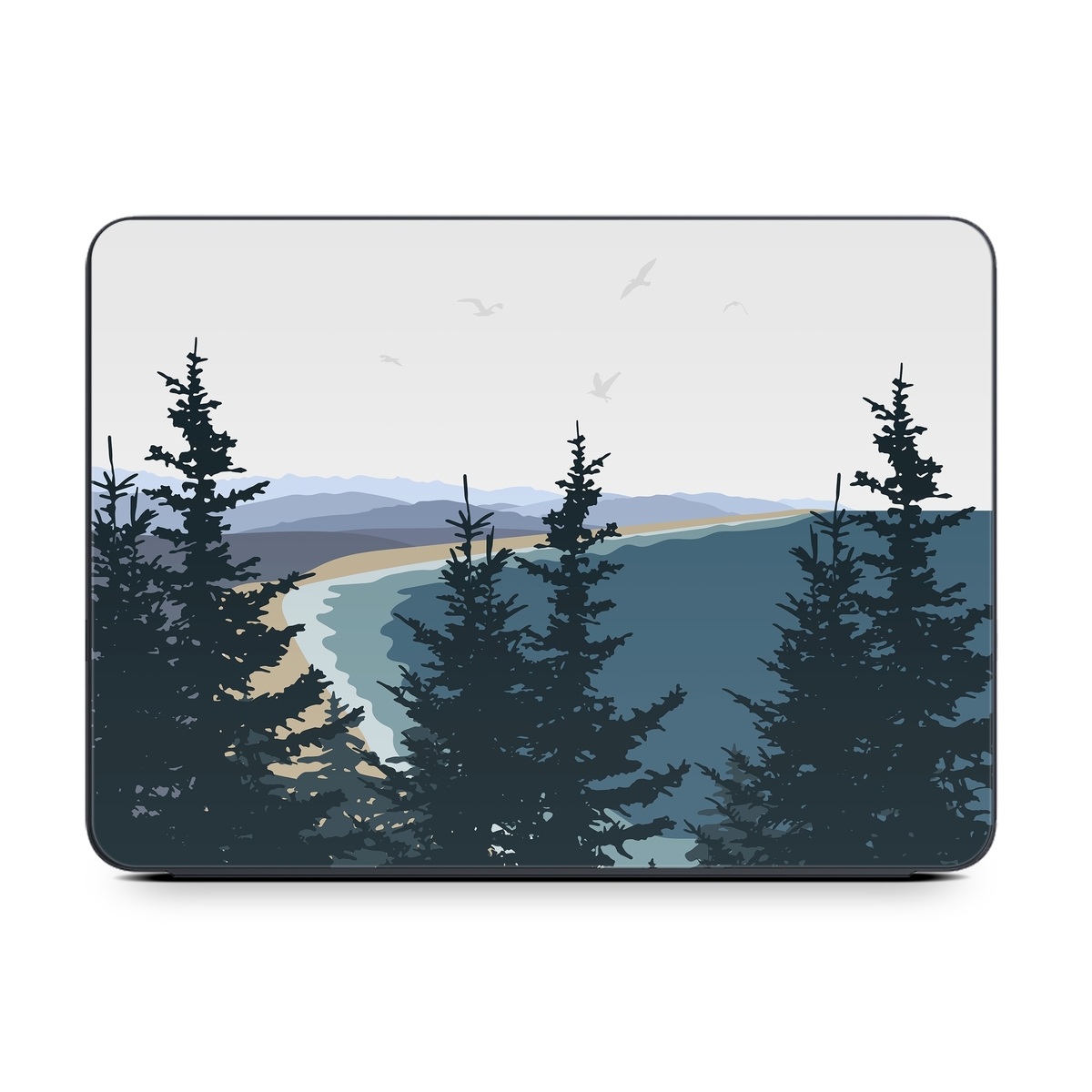 iStyles Smart Keyboard Folio for iPad Series Skin design of Sky, Plant, Mountain, Natural landscape, Branch, Larch, Tree, Highland, Atmospheric phenomenon, Evergreen, with white, blue, yellow, gray, black, green colors, and tagged with nature, animals, ocean, beach, landscape, forest, trees, seagulls.