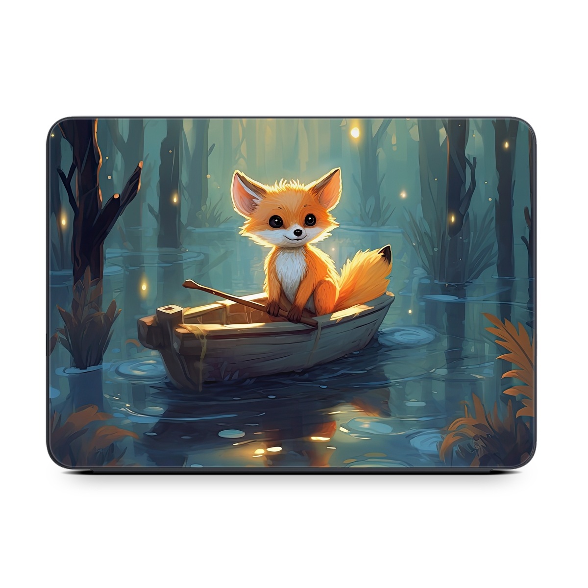 iStyles Smart Keyboard Folio for iPad Series Skin design of Water, Boat, Light, Nature, Organism, Orange, Cartoon, Watercraft, Art, Plant, with blue, yellow, orange, white, black, gray, green, brown colors, and tagged with fineart, animals, objects, fantasy, nature, fox, boat, character, water, lilies, paddle.