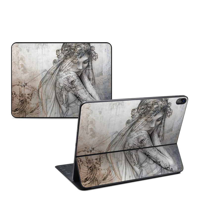 iStyles Smart Keyboard Folio for iPad Series Skin design of Lady, Art, Illustration, Drawing, Painting, Sketch, Mythology, Figure drawing, Long hair, Visual arts, with white, gray, black colors, and tagged with skulls, people, flowers, fantasy, death, ghost, goth, gothic, scythe, skull, tattoo.