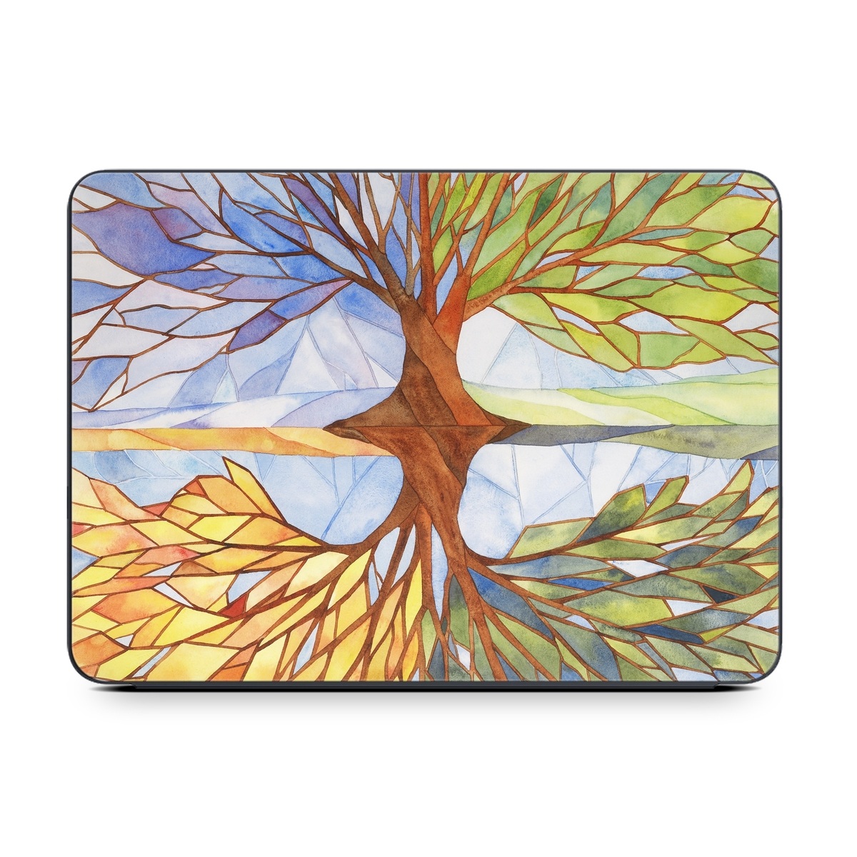 iStyles Smart Keyboard Folio for iPad Series Skin design of Leaf, Tree, Botany, Plant, Symmetry, Art, Pattern, Painting, Plant stem, Plane, with blue, brown, orange, yellow, red, purple colors, and tagged with nature, patterns, leaves, nature, plant, seasons, tree, watercolor.