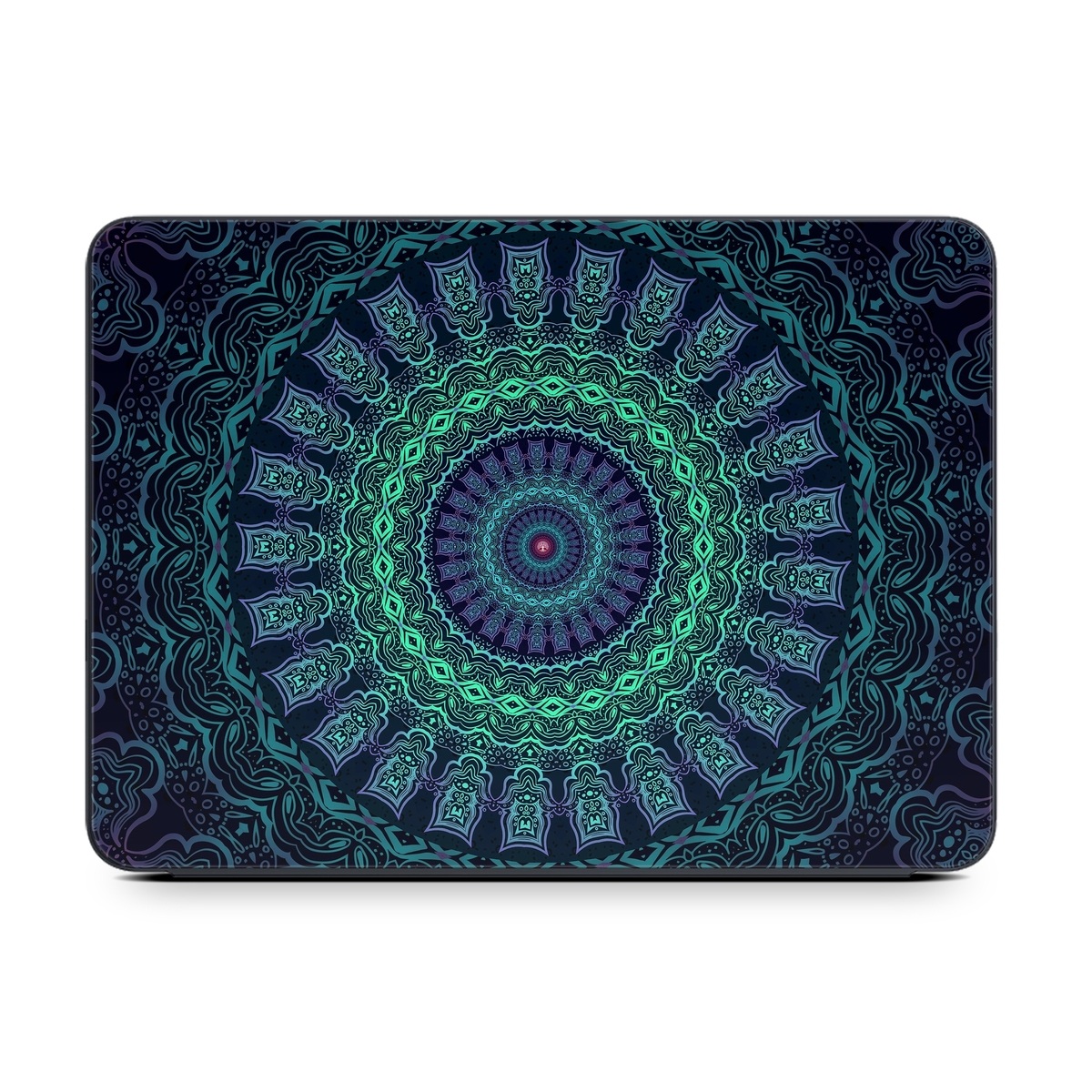 iStyles Smart Keyboard Folio for iPad Series Skin design of Colorfulness, Blue, Green, Pattern, Teal, Turquoise, Art, Electric Blue, Aqua, Circle, Majorelle Blue, Visual Arts, Fractal Art, Design, Symmetry, Psychedelic Art, Graphics, Kaleidoscope, Motif, with black, green, red colors, and tagged with patterns, fractals, balance, blue, circle, green, mandala, neon, purple, rainbow, symmetry.