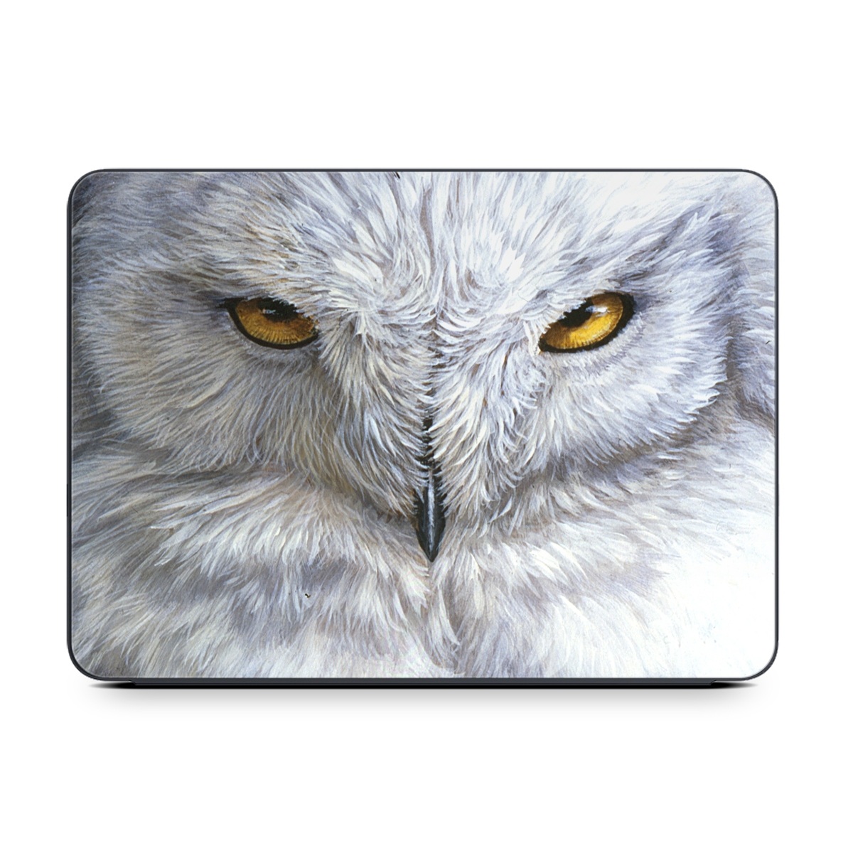 iStyles Smart Keyboard Folio for iPad Series Skin design of Owl, Bird, Bird of prey, Snowy owl, great grey owl, Close-up, Eye, Snout, Wildlife, Eastern Screech owl, with gray, white, black, blue, purple colors, and tagged with animals.