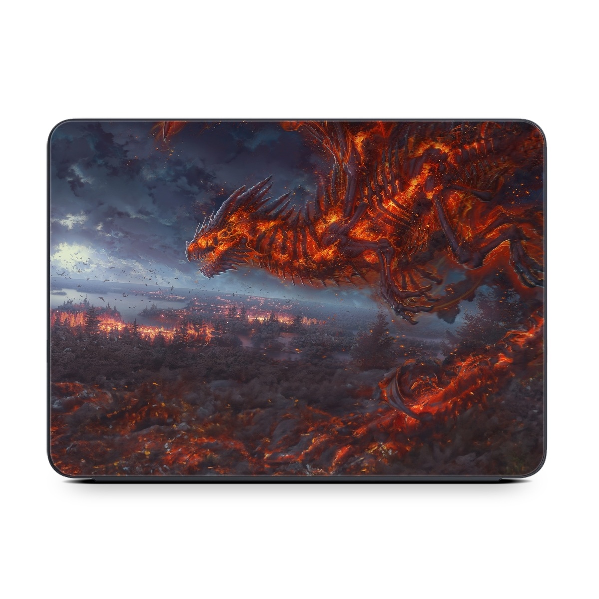 iStyles Smart Keyboard Folio for iPad Series Skin design of Geological phenomenon, Dragon, Cg artwork, Sky, Flame, Fictional character, Mythology, Lava, Demon, Heat, with red, blue, black colors, and tagged with fantasy, animals, nature, dragon, fire, flame, monster, skeleton.