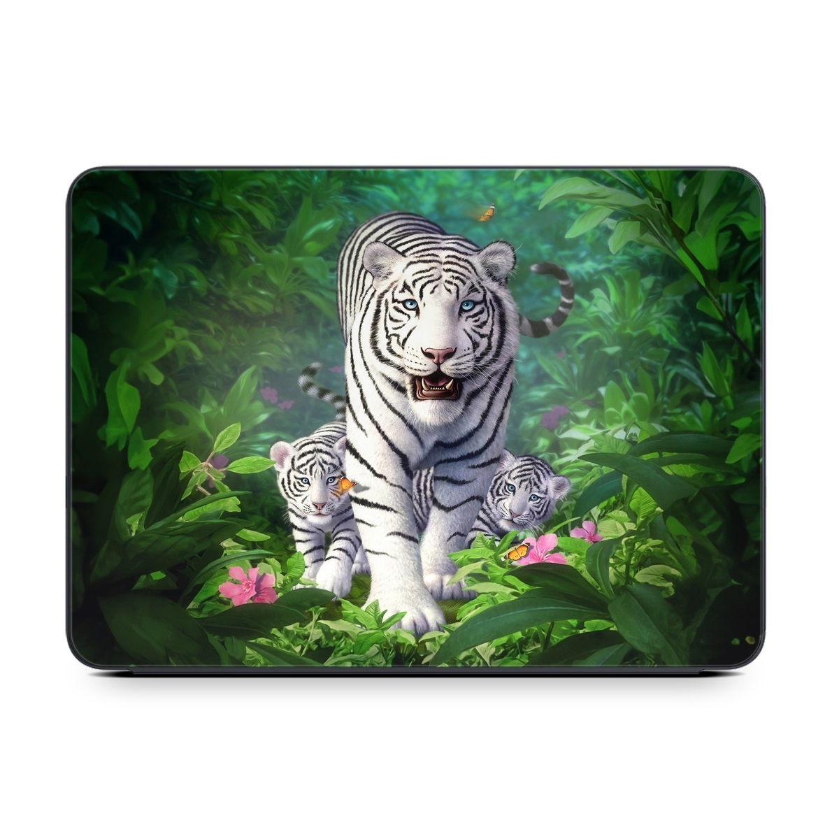 iStyles Smart Keyboard Folio for iPad Series Skin design of Plant, Eye, Plant community, Vertebrate, Felidae, Leaf, Botany, Carnivore, Organism, Terrestrial plant, with white, black, blue, green, pink, yellow colors, and tagged with animals, nature, animal, animals, cub, cubs, green, jungle, outdoor, tiger, tigers, white.
