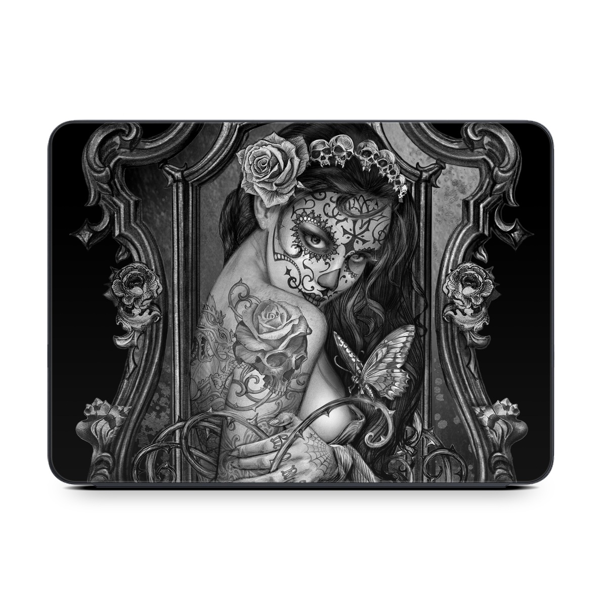 iStyles Smart Keyboard Folio for iPad Series Skin design of Style, Art, Monochrome, Black-and-white, Monochrome Photography, Visual Arts, Illustration, Painting, Drawing, with black, white, gray colors, and tagged with skulls, people, animals, flowers, objects, bride, girl, goth, gothic, lady, skull, sugarskull, tattoo, tattoos, woman.