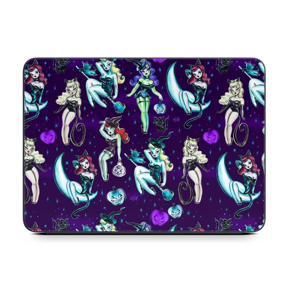 iStyles Smart Keyboard Folio for iPad Series Skin design of Illustration, Cartoon, Violet, Art, Fictional character, Graphic design, Fiction, Visual arts, Style, Graphics, with blue, green, white, yellow, red, purple colors, and tagged with people, fantasy, objects, animals, blackcat, cat, halloween, pinup, pinupgirl, witche, witches.