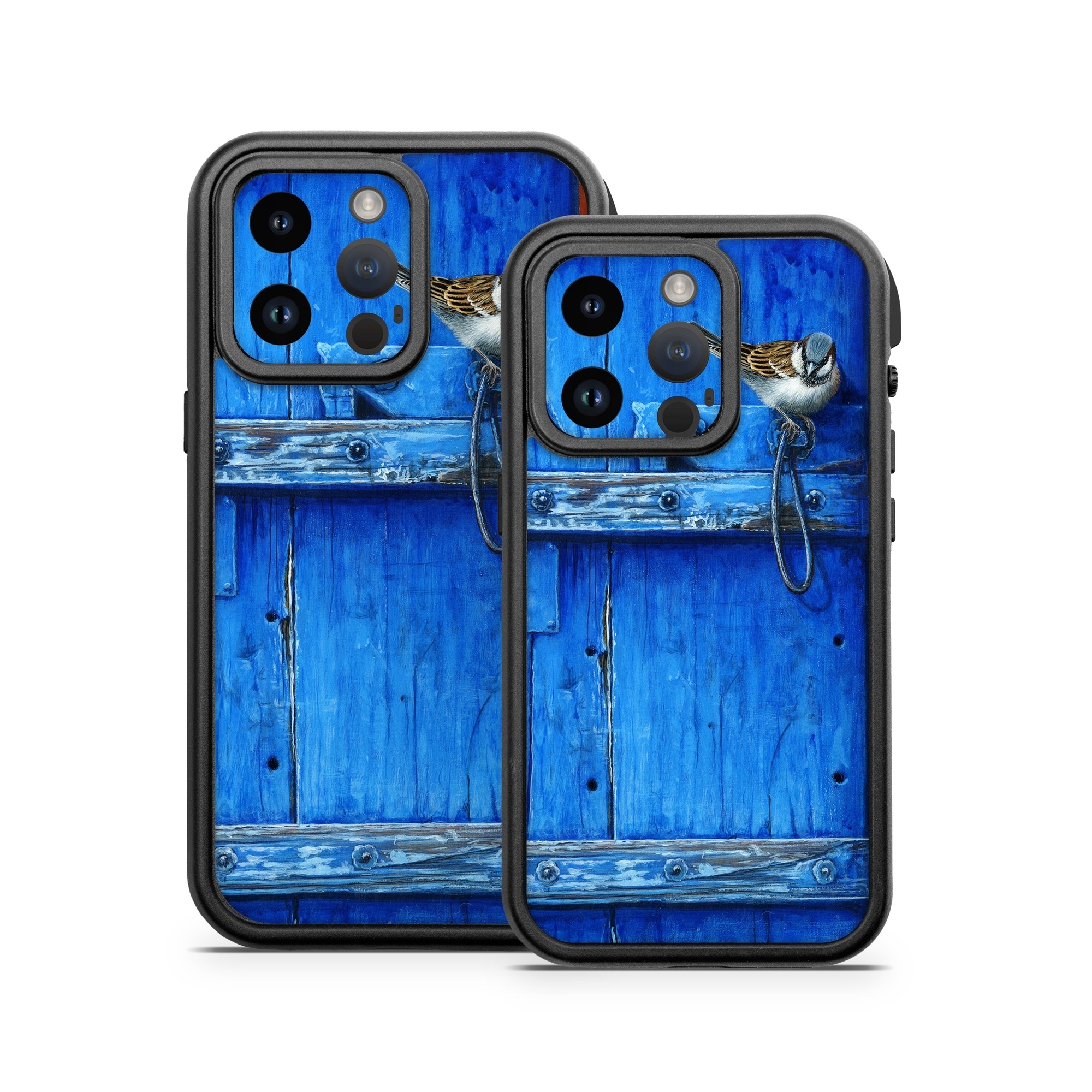 iStyles OtterBox Fre iPhone 14 Series Case Skin design of Blue, Wood, Door handle, Door, Wall, Door knocker, Electric blue, Still life photography, Window, Handle, with red, blue, brown colors, and tagged with animals, fineart, animal, bird, birds, fineart, outdoors.