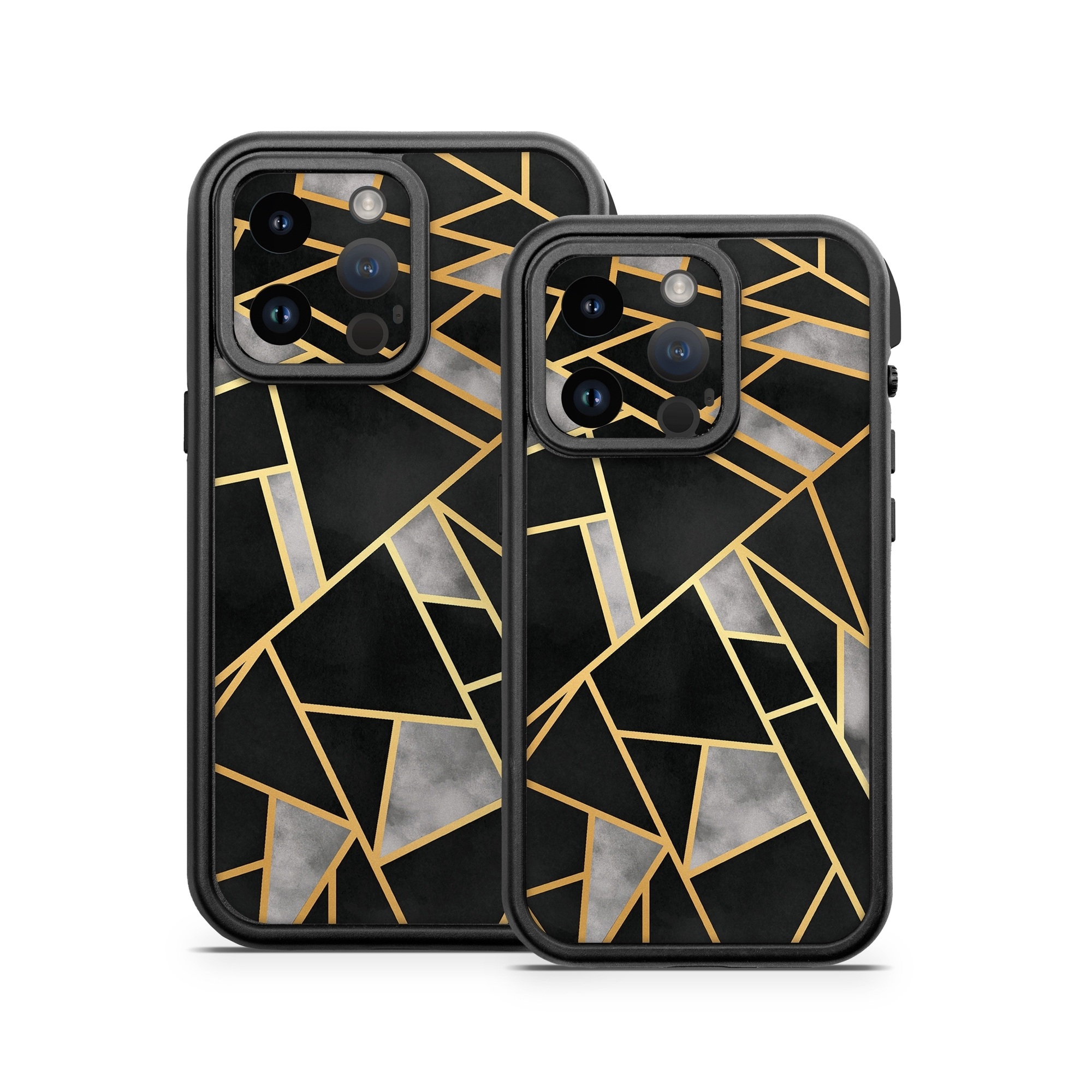 iStyles OtterBox Fre iPhone 14 Series Case Skin design of Pattern, Triangle, Yellow, Line, Tile, Floor, Design, Symmetry, Architecture, Flooring, with black, gray, yellow colors, and tagged with patterns.
