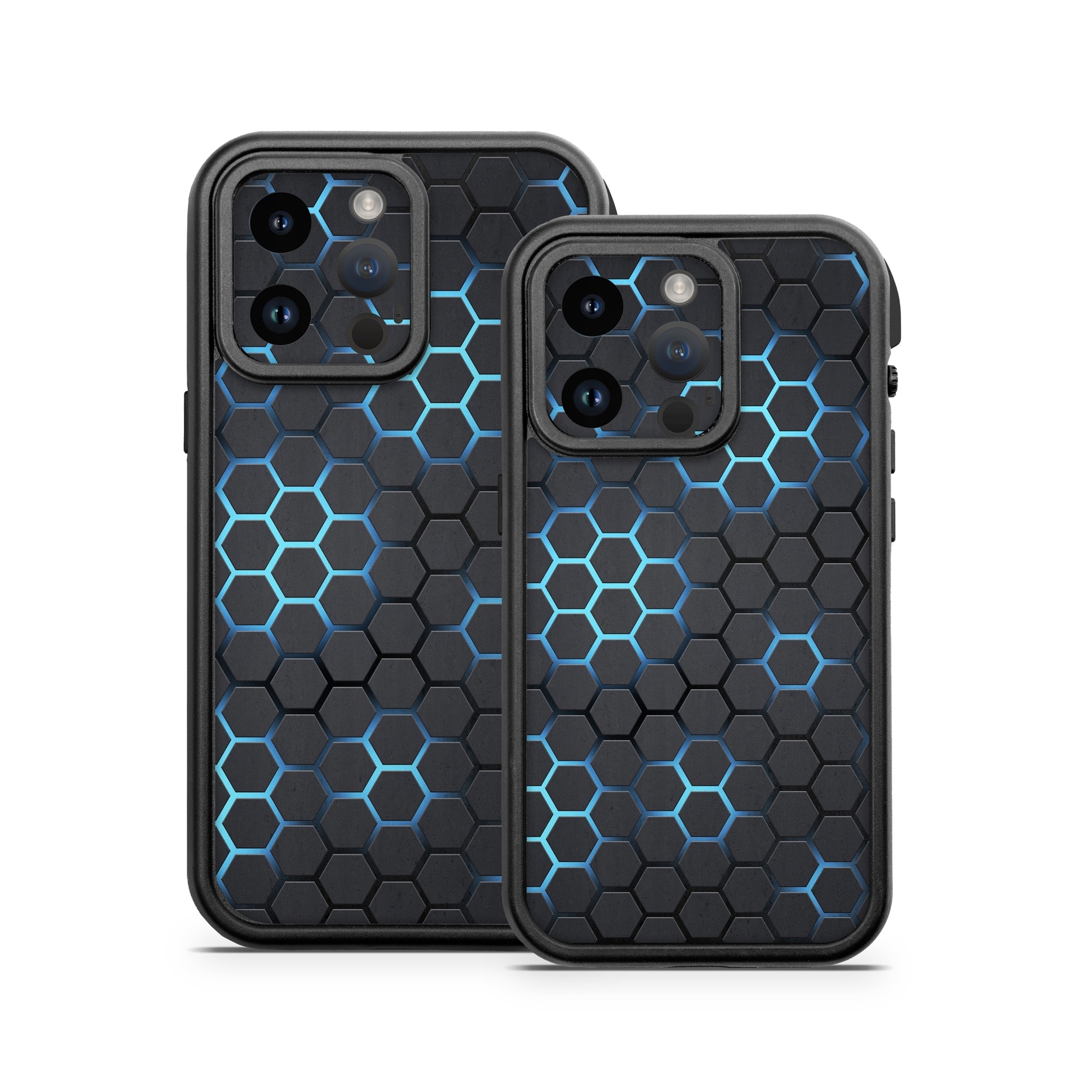 iStyles OtterBox Fre iPhone 14 Series Case Skin design of Pattern, Water, Design, Circle, Metal, Mesh, Sphere, Symmetry, with black, gray, blue colors, and tagged with lookslike, fantasy, space, drones, geometric, hexagon, tech.