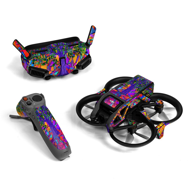 iStyles DJI Avata Skin design of Psychedelic art, Pattern, Visual arts, Art, Plant, Acrylic paint, Modern art, with green, purple, orange, blue, purple, yellow, red colors, and tagged with patterns, nature, bright, nature, stainedglass, tree.