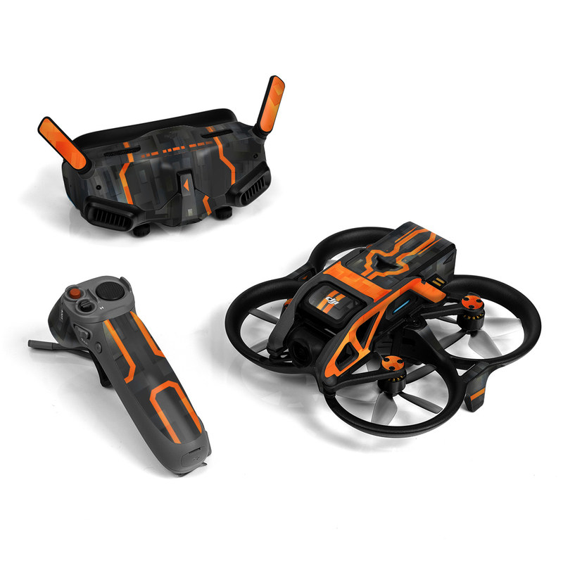iStyles DJI Avata Skin design of Orange, Font, Parallel, Pattern, Graphics, Rectangle, Logo, Brand, Graphic design, Event, with black, orange colors, and tagged with patterns, lookslike, space, spaceship, fighterjet.