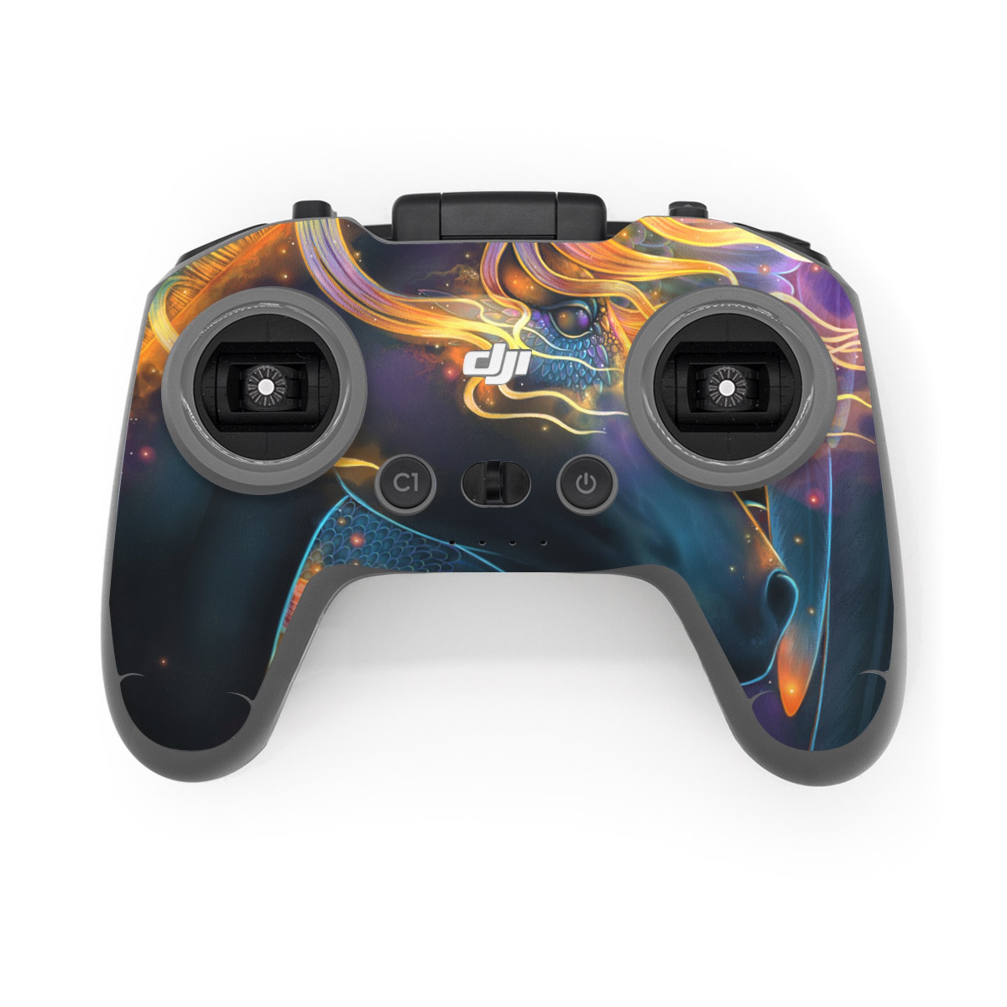 iStyles DJI FPV Remote Controller 3 Skin design of Organism, Astronomical object, Art, Electric blue, Space, Darkness, Liquid, Science, Graphics, Visual arts, with black, blue, yellow, white, orange, purple, red colors, and tagged with fantasy, animals, space, flames, horse, stars, constellations, sun.