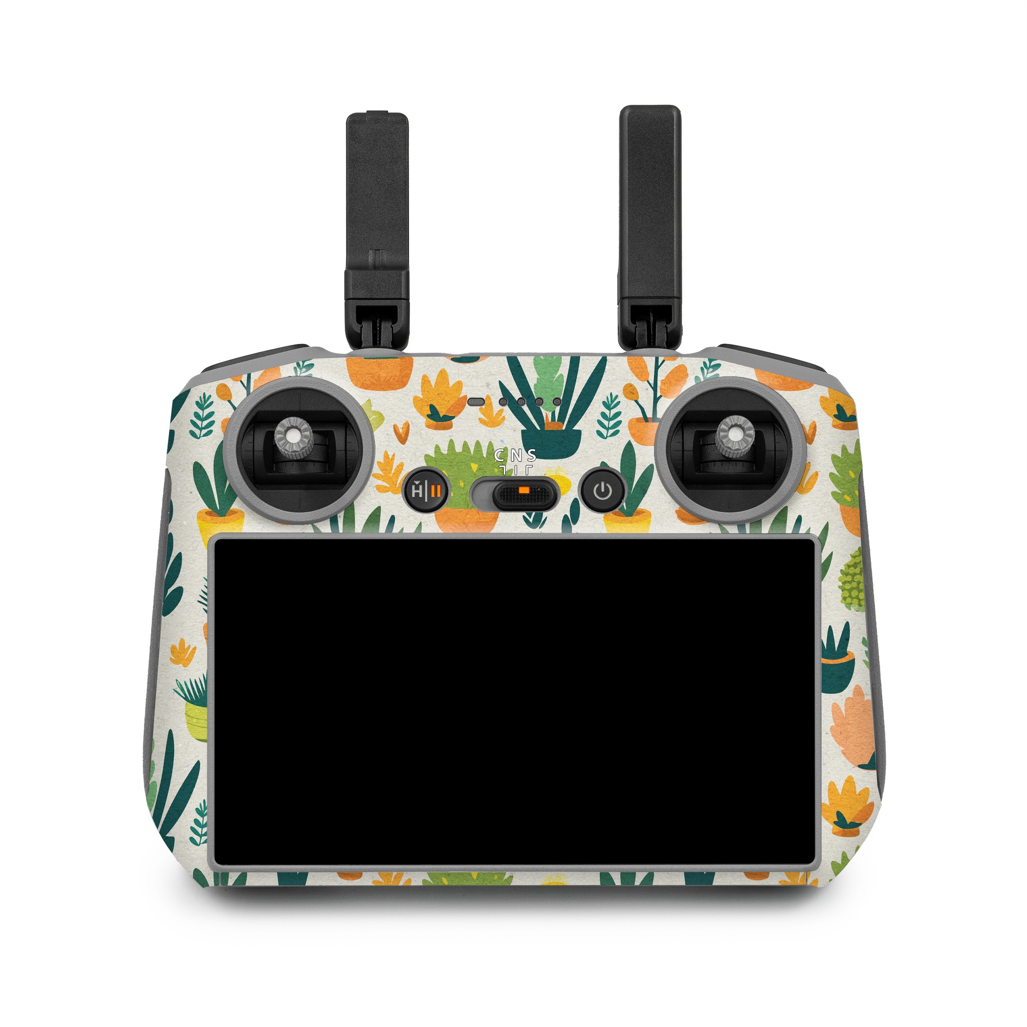 iStyles DJI RC 2 Skin design of Flower, Plant, Petal, Textile, Botany, Art, Creative arts, Flowering plant, Porcelain, Groundcover, with white, green, brown, yellow, orange colors, and tagged with patterns, objects, nature, plants, pots, gardening, pattern.