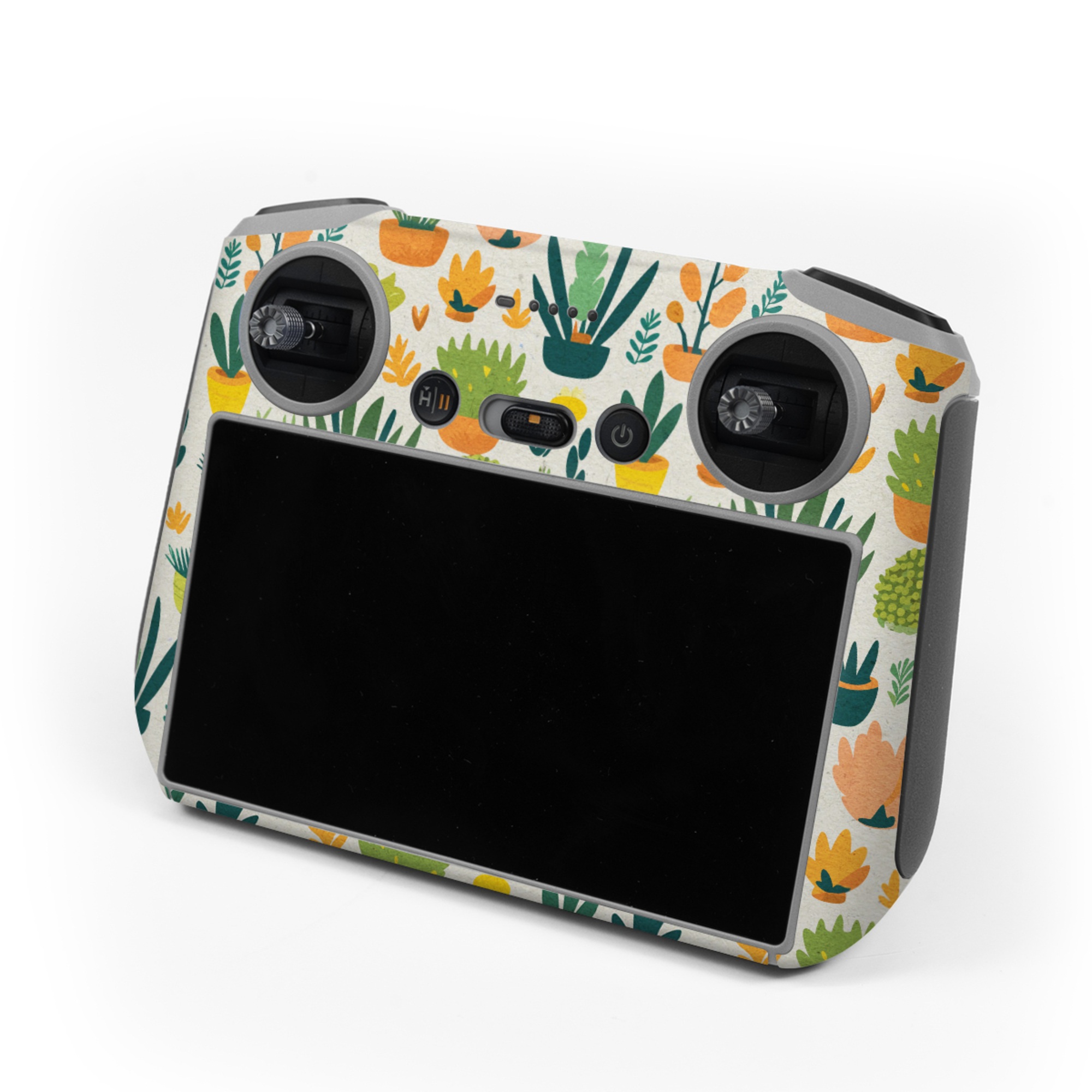 iStyles DJI RC Skin design of Flower, Plant, Petal, Textile, Botany, Art, Creative arts, Flowering plant, Porcelain, Groundcover, with white, green, brown, yellow, orange colors, and tagged with patterns, objects, nature, plants, pots, gardening, pattern.