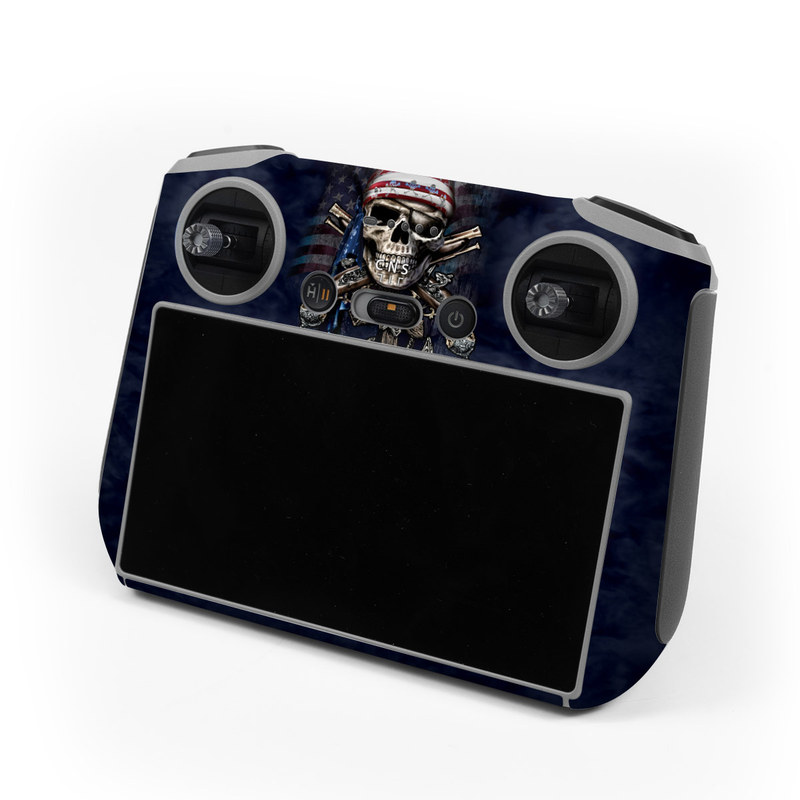 iStyles DJI RC Skin design of Skull, Bone, Skeleton, Illustration, Outerwear, T-shirt, Flag, Art, with black, gray, red colors, and tagged with skulls, flags, objects.