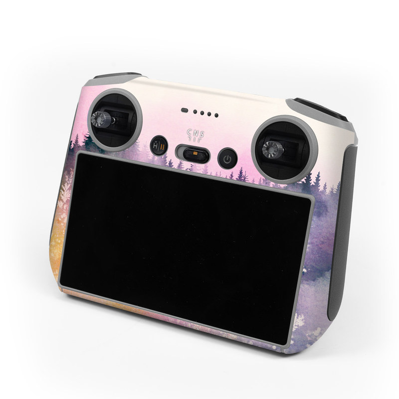 iStyles DJI RC Skin design of Watercolor paint, Sky, Atmospheric phenomenon, Tree, Atmosphere, Cloud, Landscape, Forest, Painting, Illustration, with white, yellow, pink, purple, blue, black colors, and tagged with nature, flowers, floral, nature, pine, plants, trees.