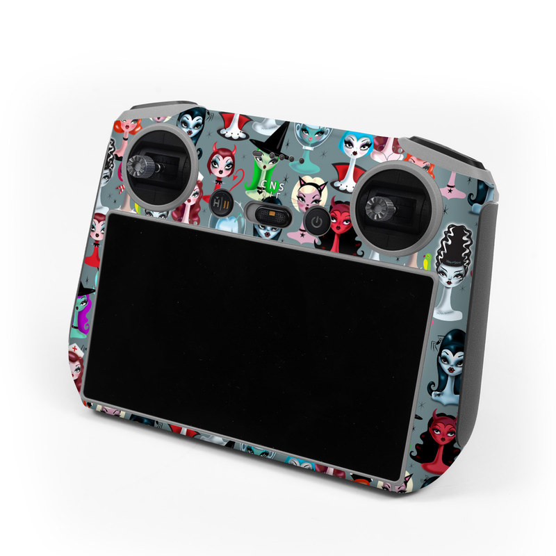 iStyles DJI RC Skin design of Facial expression, Head, Design, Collection, Fictional character, Pattern, Skull, Illustration, Collage, Style, with gray, white, red, blue, green, black, pink, purple colors, and tagged with people, fantasy, objects, costume, halloween, horror, pinup, pinupgirl.