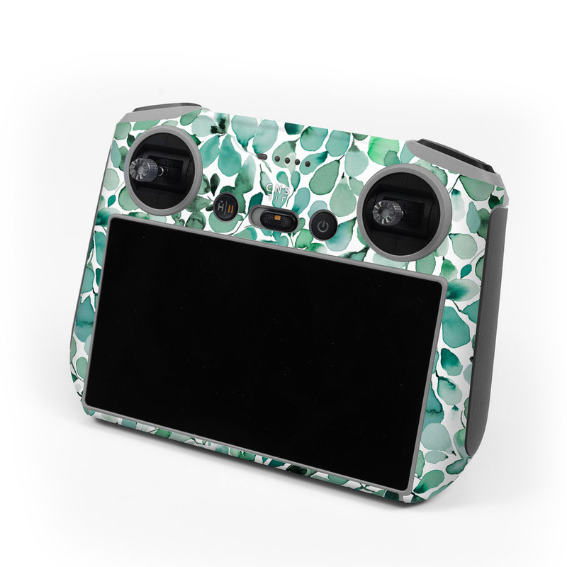 iStyles DJI RC Skin design of Azure, Line, Aqua, Pattern, Art, Symmetry, Electric blue, Circle, Creative arts, Terrestrial plant, with white, green, black colors, and tagged with patterns, nature, filigree, garden, green, leaves, nature, paint, painting, teal, turquoise, watercolor.