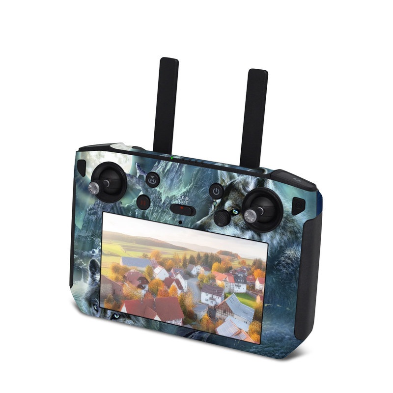 iStyles DJI Smart Controller Skin design of Cg artwork, Fictional character, Darkness, Werewolf, Illustration, Wolf, Mythical creature, Graphic design, Dragon, Mythology, with black, blue, gray, white colors, and tagged with animals, space.