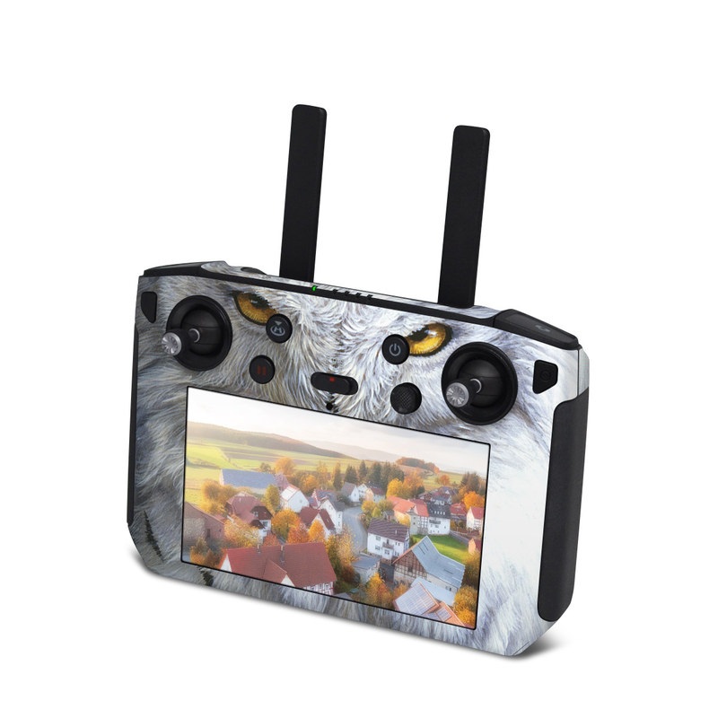 iStyles DJI Smart Controller Skin design of Owl, Bird, Bird of prey, Snowy owl, great grey owl, Close-up, Eye, Snout, Wildlife, Eastern Screech owl, with gray, white, black, blue, purple colors, and tagged with animals.