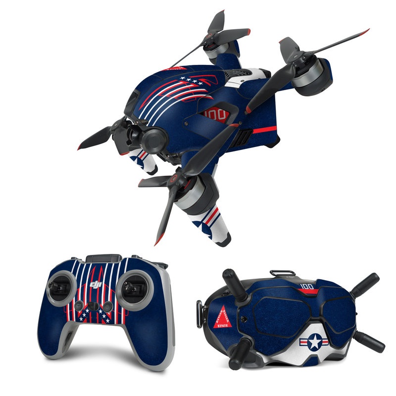iStyles DJI FPV Combo Skin design of Sleeve, Font, Motor vehicle, T-shirt, Emblem, Poster, Electric blue, Symmetry, Symbol, Pattern, with blue, red, white colors, and tagged with objects, military, patterns, danger, dangerzone, jet, maverick, topgun.