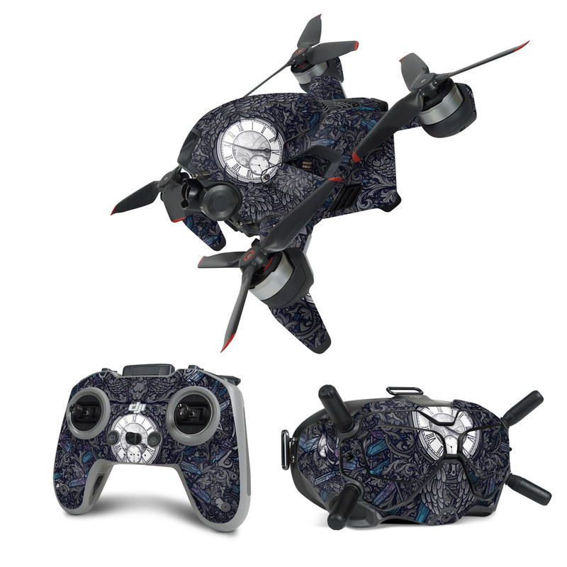 iStyles DJI FPV Combo Skin design of Blue, Pattern, Psychedelic art, Design, Circle, Art, Font, Graphic design, Visual arts, Illustration, with black, gray colors, and tagged with objects, patterns, animals, grandfather, clock, clocks, alarm, time, antique, table.