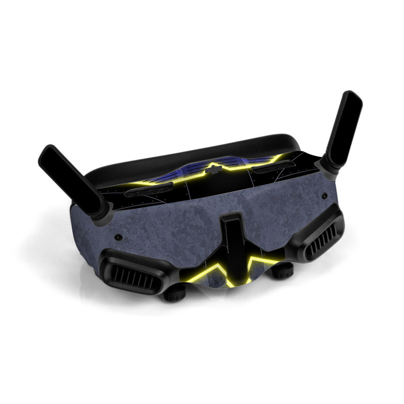 iStyles DJI Goggles 2 Skin design of Blue, Symbol, Symmetry, Graphics, Triangle, Graphic design, with black, purple, gray, yellow colors, and tagged with lookslike, fantasy, signs, bat, batman, blue, bruce, wayne, darkknight, dc, knight.