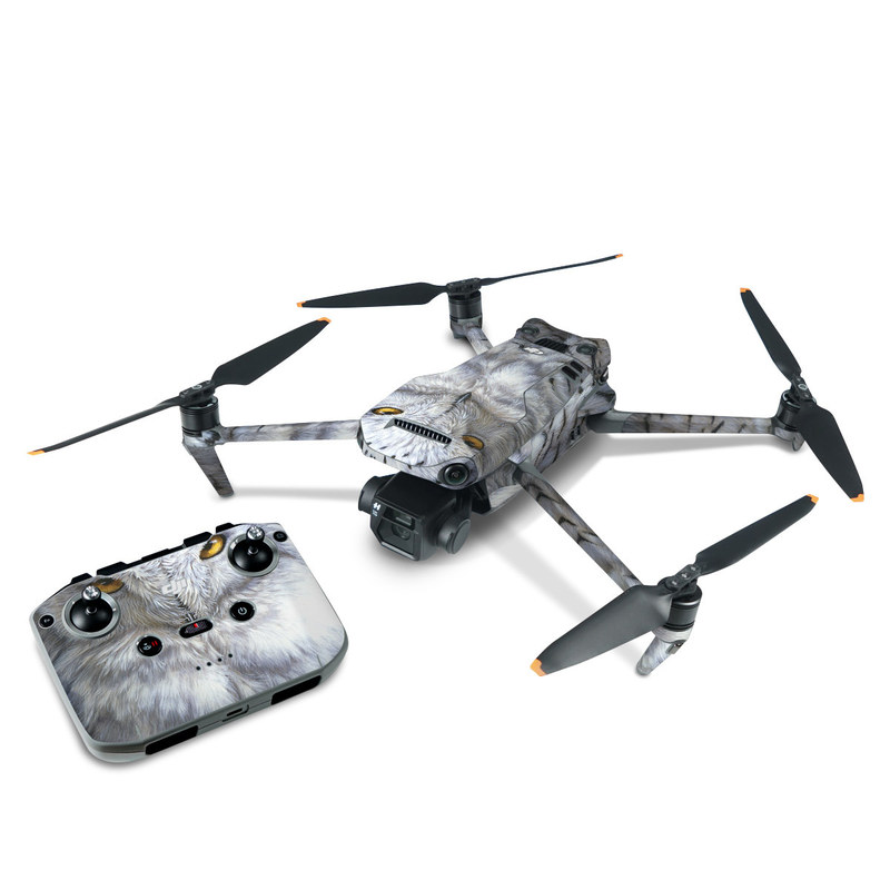 iStyles DJI Mavic 3 Skin design of Owl, Bird, Bird of prey, Snowy owl, great grey owl, Close-up, Eye, Snout, Wildlife, Eastern Screech owl, with gray, white, black, blue, purple colors, and tagged with animals.