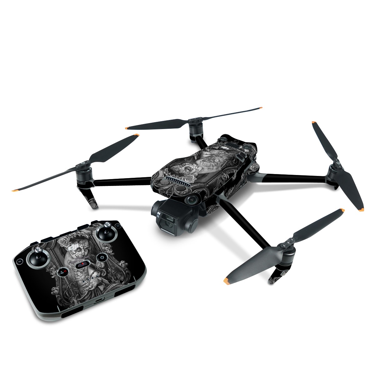 iStyles DJI Mavic 3 Skin design of Style, Art, Monochrome, Black-and-white, Monochrome Photography, Visual Arts, Illustration, Painting, Drawing, with black, white, gray colors, and tagged with skulls, people, animals, flowers, objects, bride, girl, goth, gothic, lady, skull, sugarskull, tattoo, tattoos, woman.