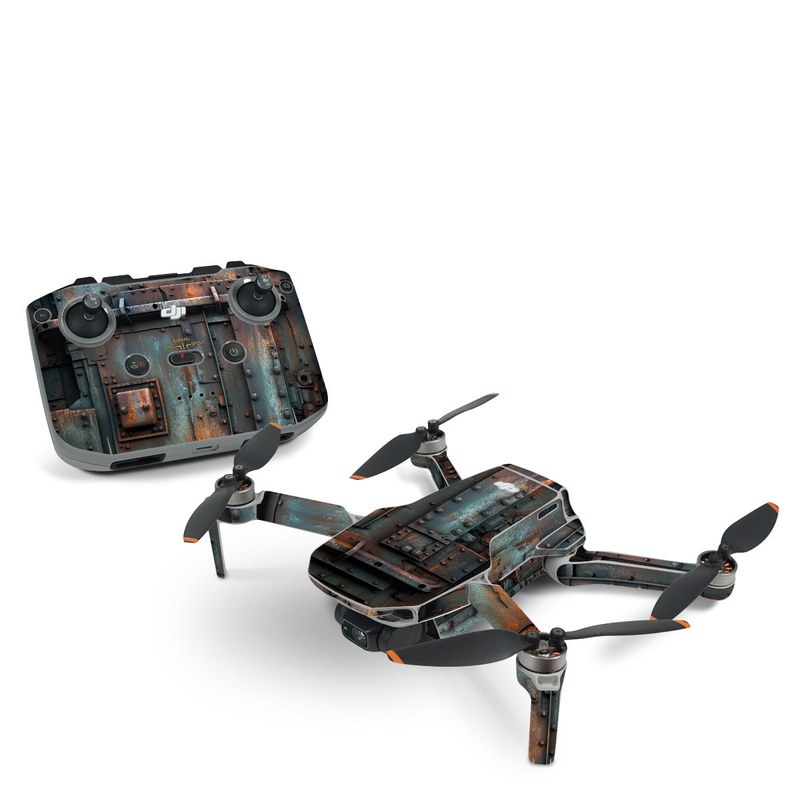 iStyles DJI Mini 2 Skin design of Wood, Train, Wheel, Motor vehicle, Mode of transport, Rolling, Automotive lighting, Rolling stock, freight car, Gas, with black, brown, gray, white, orange colors, and tagged with lookslike, objects, safe, vault, bank, steel, rust.