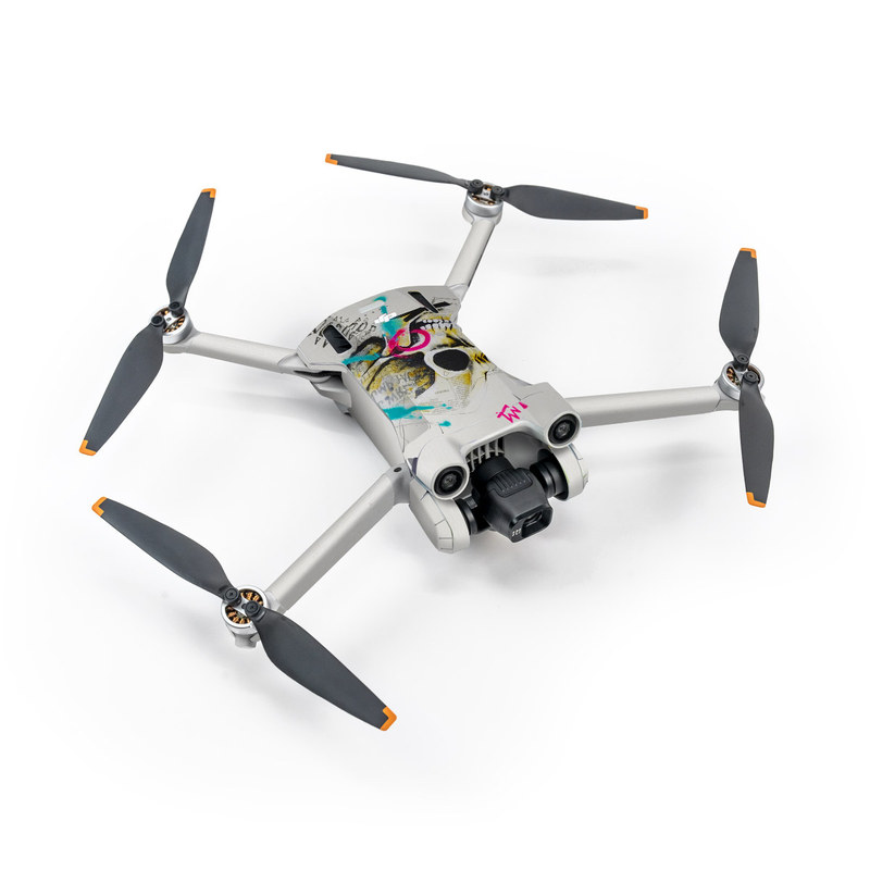 iStyles DJI Mini 3 Series Skin design of Graphic design, Skull, Illustration, Art, Bone, Drawing, Visual arts, Font, Modern art, Street art, with blue, pink, yellow, black colors, and tagged with skulls, abstract.