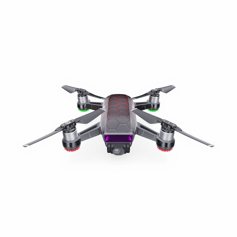 iStyles DJI Spark Skin design of Black, Pattern, Metal, Design, Mesh, Carbon, Space, Wallpaper, with black, red colors, and tagged with lookslike, fantasy, space, drones, geometric, hexagon, tech.