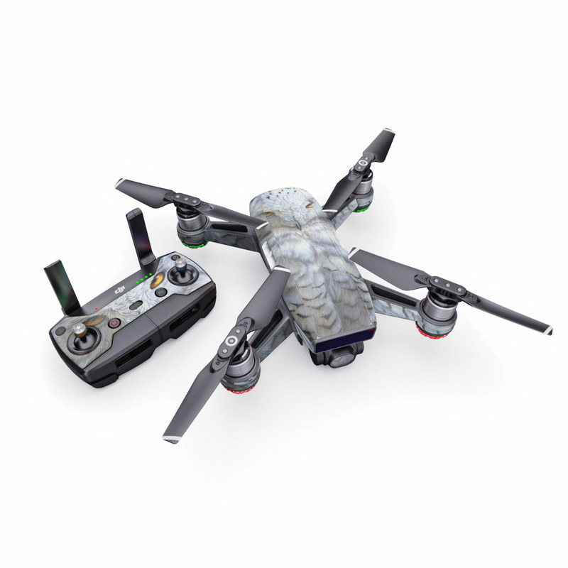 iStyles DJI Spark Skin design of Owl, Bird, Bird of prey, Snowy owl, great grey owl, Close-up, Eye, Snout, Wildlife, Eastern Screech owl, with gray, white, black, blue, purple colors, and tagged with animals.