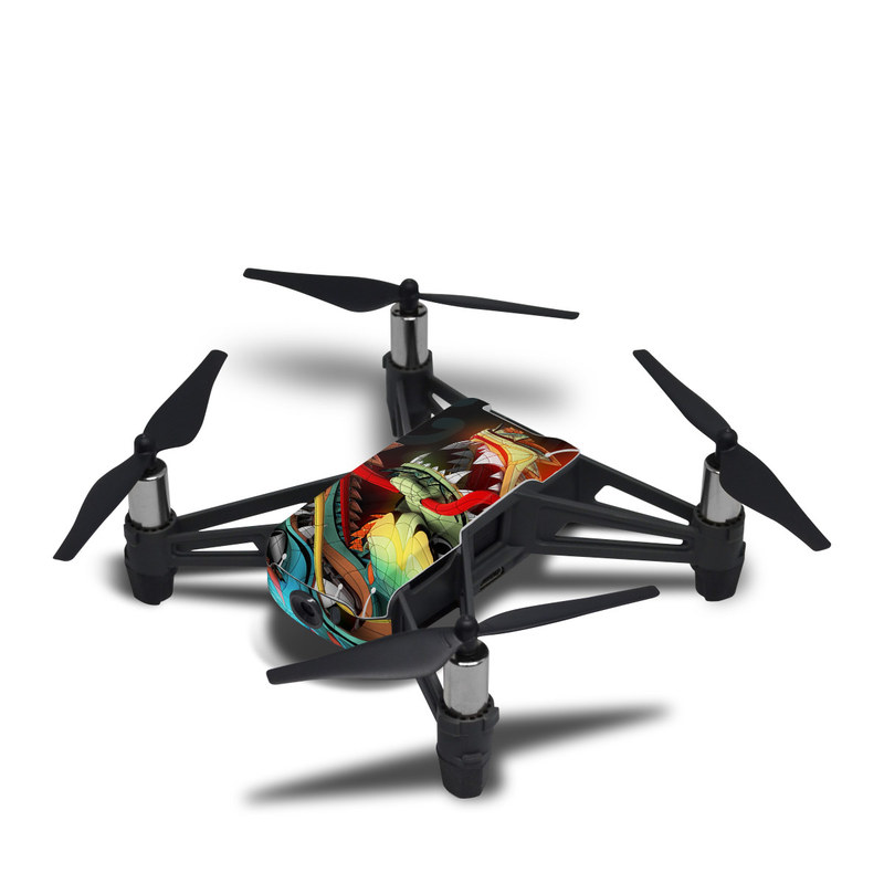 iStyles DJI Tello Skin design of Dragon, Fictional character, Illustration, Art, Cg artwork, Fiction, Mythical creature, Graphics, with black, green, red, yellow, orange colors, and tagged with animals, fantasy, blue, dragons, green, orange, tattoo.