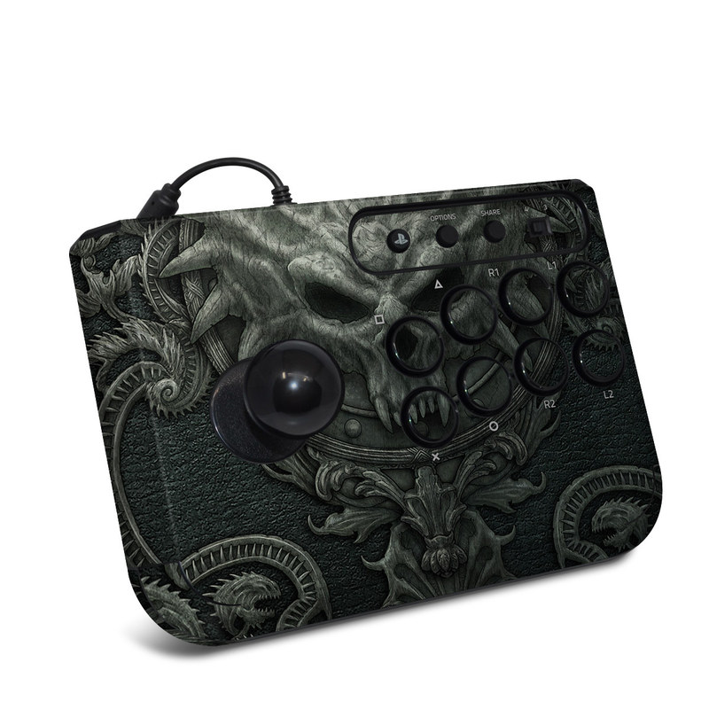 iStyles HORI Fighting Stick Mini 4 Skin design of Demon, Dragon, Fictional character, Illustration, Supernatural creature, Drawing, Symmetry, Art, Mythology, Mythical creature, with black, gray colors, and tagged with fantasy, patterns.
