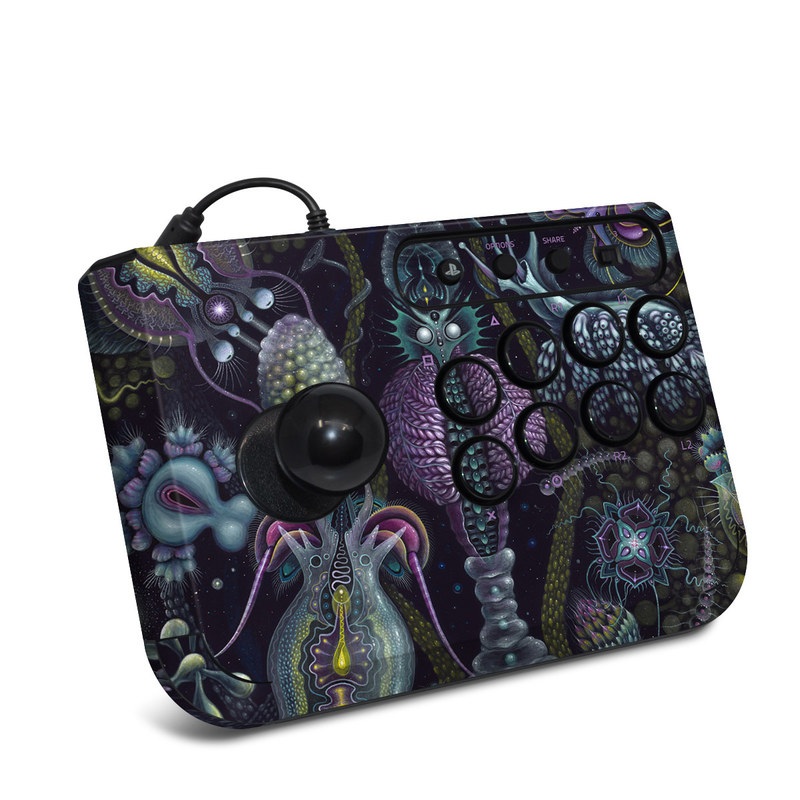 iStyles HORI Fighting Stick Mini 4 Skin design of Organism, Pattern, Art, Illustration, Fractal art, Psychedelic art, Design, Visual arts, Plant, Modern art, with black, green, purple, pink, yellow, blue colors, and tagged with animals, fantasy, abstract, bugs, creatures, sci-fi, sealife.