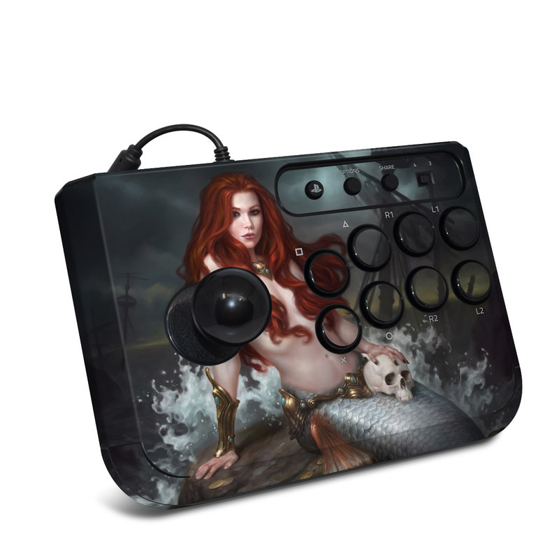iStyles HORI Fighting Stick Mini 4 Skin design of Mermaid, Cg artwork, Illustration, Fictional character, Mythology, Mythical creature, Art, Long hair, Woman warrior, Sitting, with black, brown, red, yellow, white, gray colors, and tagged with fantasy, skulls, people, fantasy, mermaid, ocean, pirateships, ships, skull.