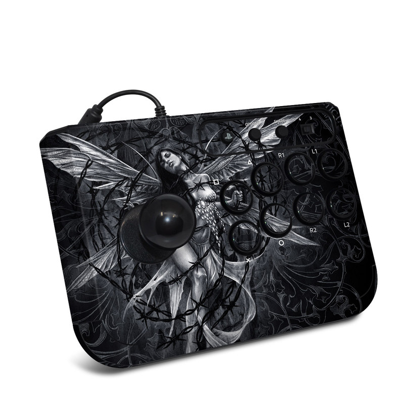 iStyles HORI Fighting Stick Mini 4 Skin design of Illustration, Graphic design, Darkness, Fictional character, Black-and-white, Pattern, Graphics, Mythical creature, Circle, Wing, with black, white colors, and tagged with flowers, signs, fantasy, people, hearts, angel, barbwire, gothic, steampunk, tattoo, tattooart.