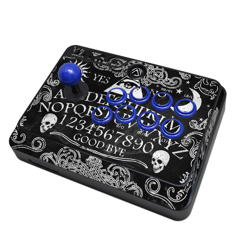 iStyles Mayflash Arcade Fightstick F300 Skin design of Text, Font, Pattern, Design, Illustration, Headpiece, Tiara, Black-and-white, Calligraphy, Hair accessory, with black, white, gray colors, and tagged with signs, skulls, black, demons, ghosts, magic, magick, paranormal, skull, spirit, talking.
