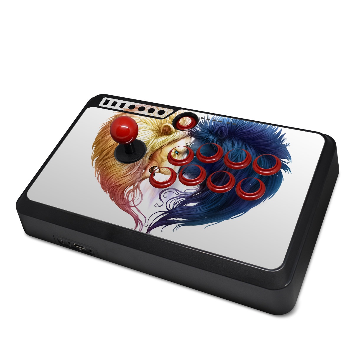 iStyles Mayflash Arcade Fightstick F500 Skin design of Vertebrate, Eyelash, Mammal, Ear, Gesture, Cartoon, Art, Painting, Happy, Paint, with white, black, blue, orange, yellow, red, purple colors, and tagged with animals, signs, blue, lion, yellow, yinyang.