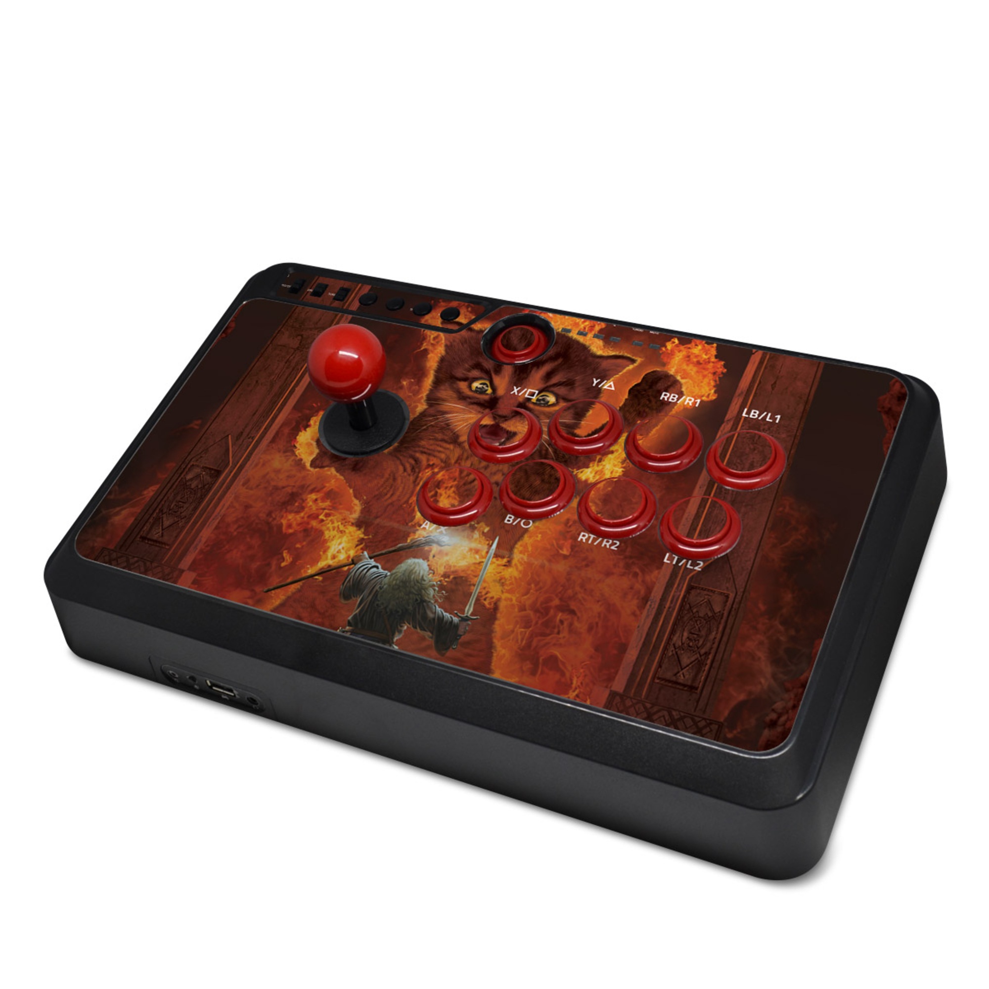 iStyles Mayflash Arcade Fightstick F500 Skin design of Cartoon, Art, Carnivore, Cg artwork, Felidae, Supernatural creature, Big cats, Heat, Fictional character, Darkness, with black, red, white, gray, yellow colors, and tagged with animals, fantasy, objects, people, flames, cat, wizard, fire, sword, magic, gatekeeper.
