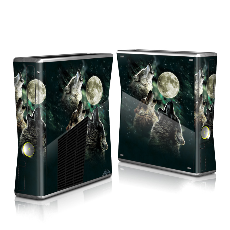 iStyles Xbox 360 S Skin design of Wolf, Light, Astronomical object, Moon, Wildlife, Organism, Moonlight, Sky, Atmosphere, Celestial event, with black, gray, green colors, and tagged with animals.