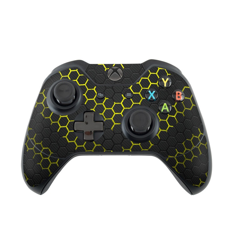 iStyles Xbox One Controller Skin design of Black, Pattern, Yellow, Mesh, Net, Chain-link fencing, Design, Metal, with black, gray, yellow colors, and tagged with lookslike, space, fantasy, animals, drones, geometric, hexagon, tech.