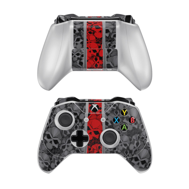 iStyles Xbox One Controller Skin design of Font, Text, Pattern, Design, Graphic design, Black-and-white, Monochrome, Graphics, Illustration, Art, with black, red, gray colors, and tagged with skulls, patterns.