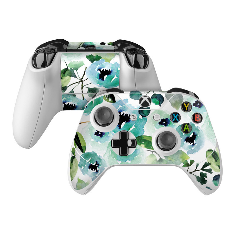 iStyles Xbox One Controller Skin design of Green, Pattern, Leaf, Aqua, Plant, Design, Branch, Organism, Flower, Ivy, with white, green, blue, black colors, and tagged with flowers, patterns, floral, flowers, pattern, peonies, sara, saraberrenson, watercolor.