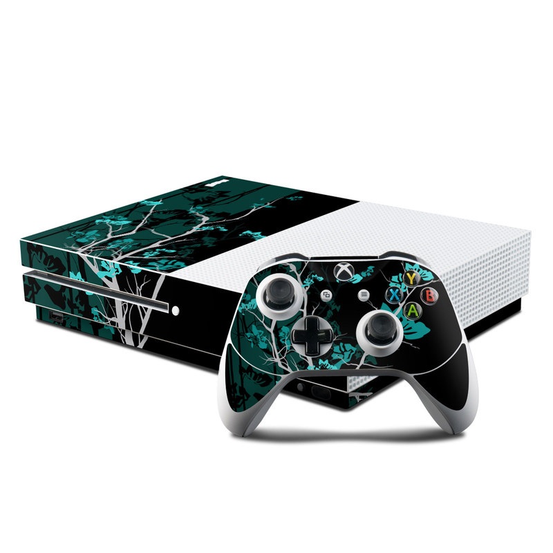 iStyles Xbox One S Skin design of Branch, Black, Blue, Green, Turquoise, Teal, Tree, Plant, Graphic design, Twig, with black, blue, gray colors, and tagged with flowers.