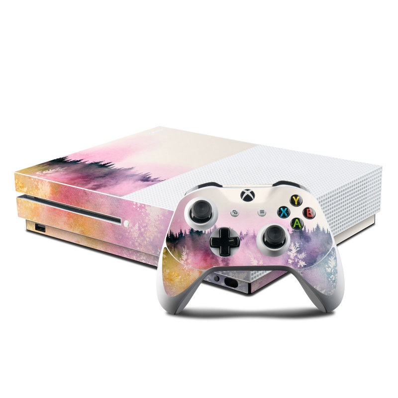 iStyles Xbox One S Skin design of Watercolor paint, Sky, Atmospheric phenomenon, Tree, Atmosphere, Cloud, Landscape, Forest, Painting, Illustration, with white, yellow, pink, purple, blue, black colors, and tagged with nature, flowers, floral, nature, pine, plants, trees.